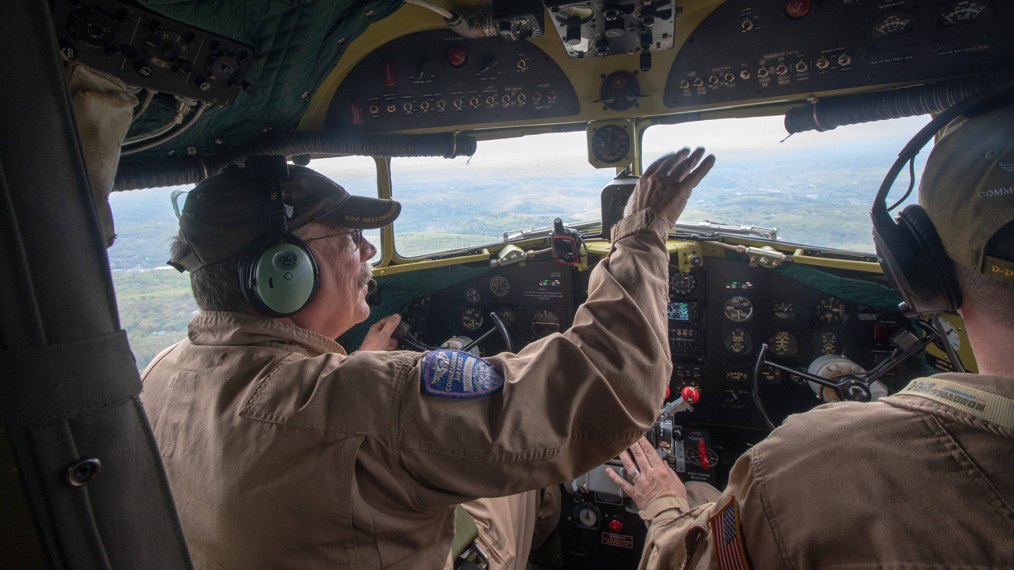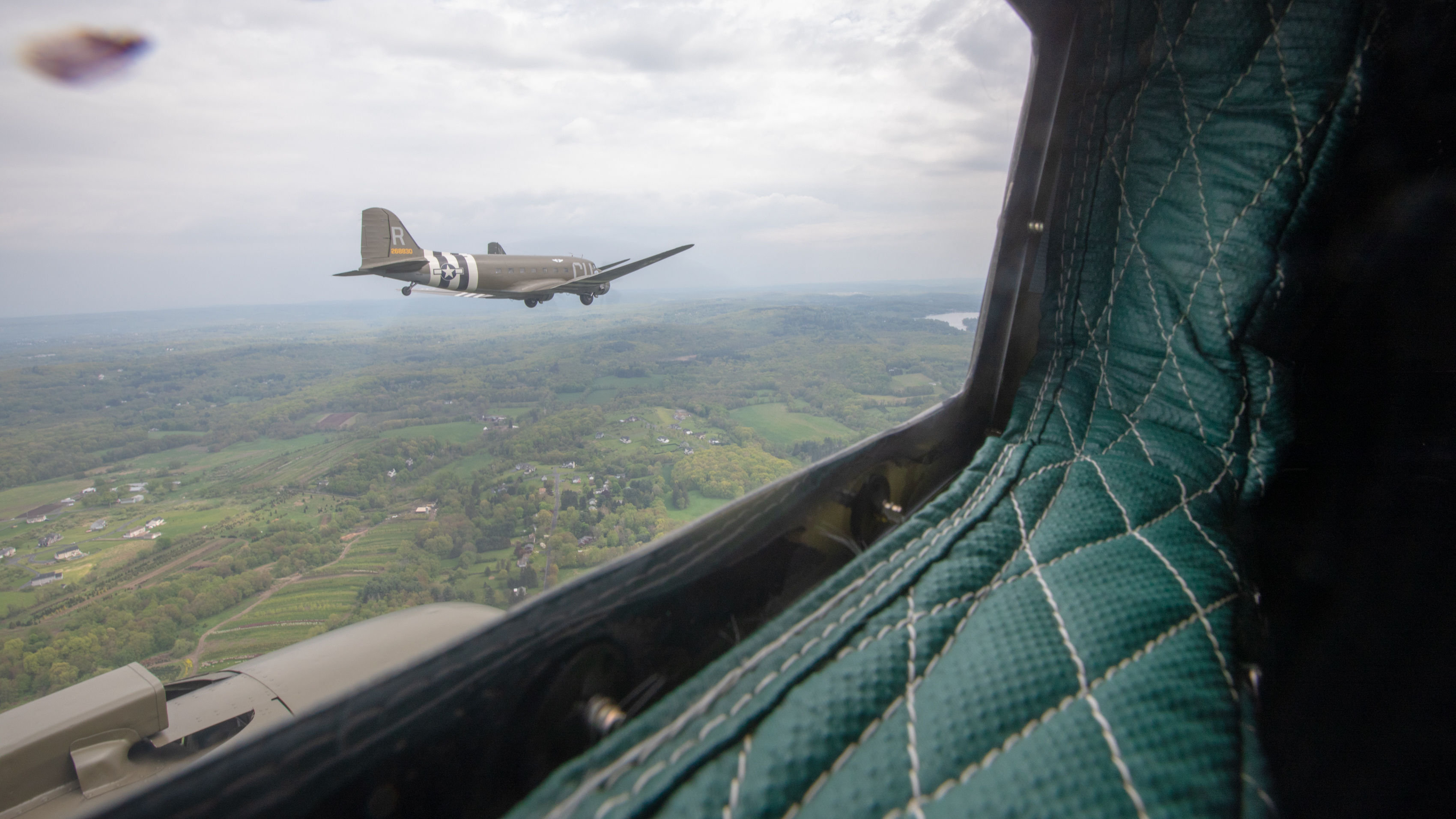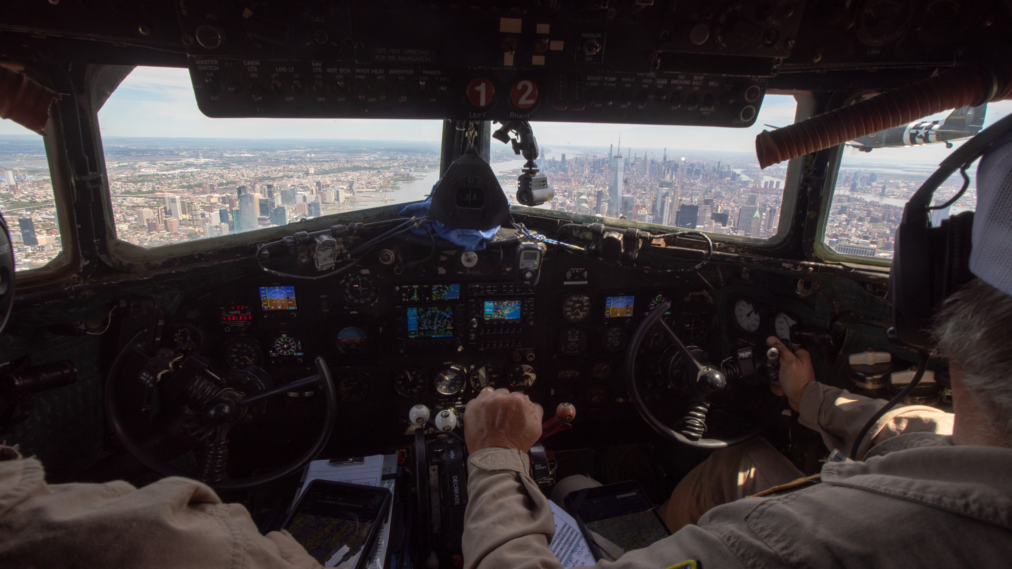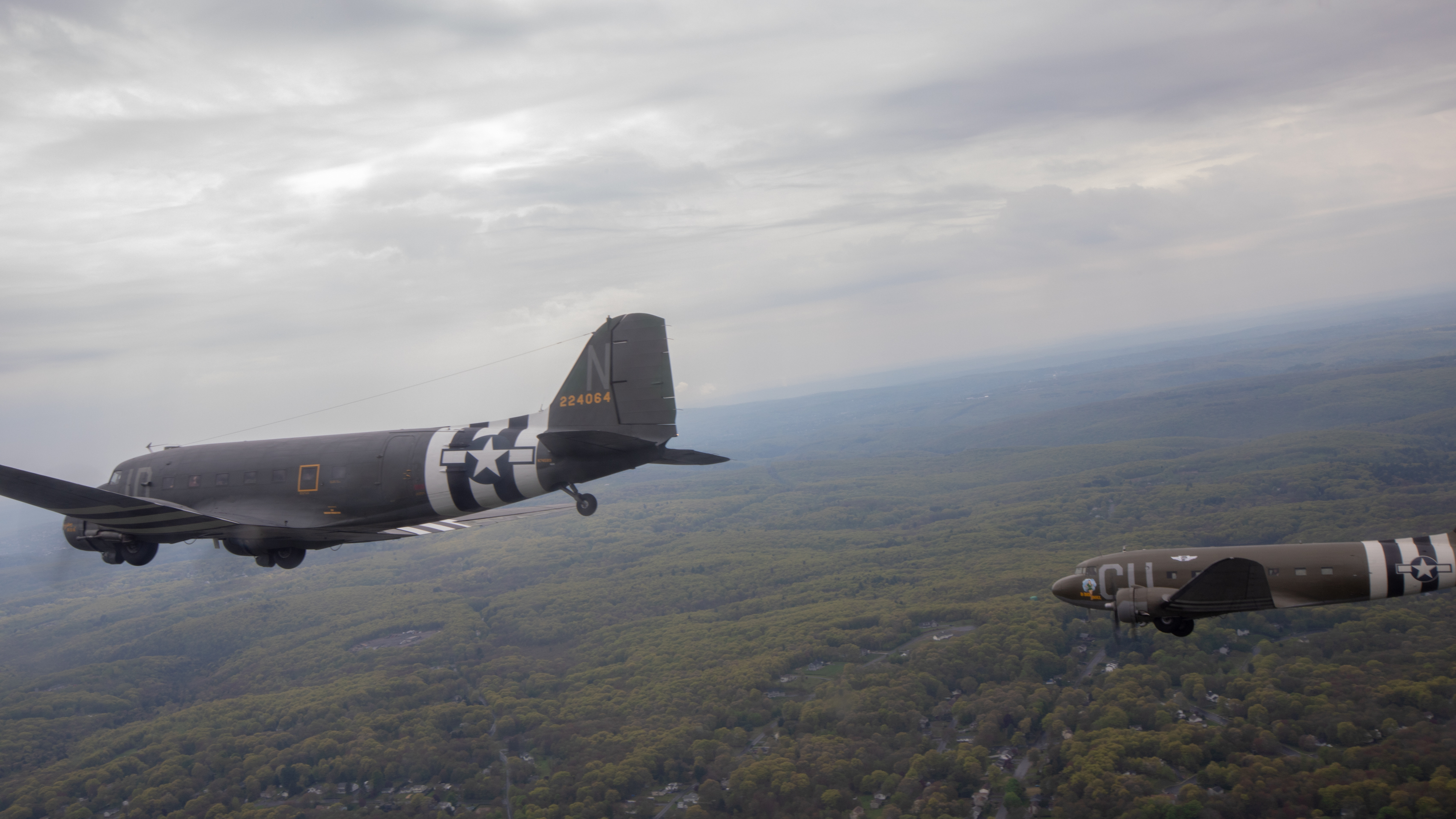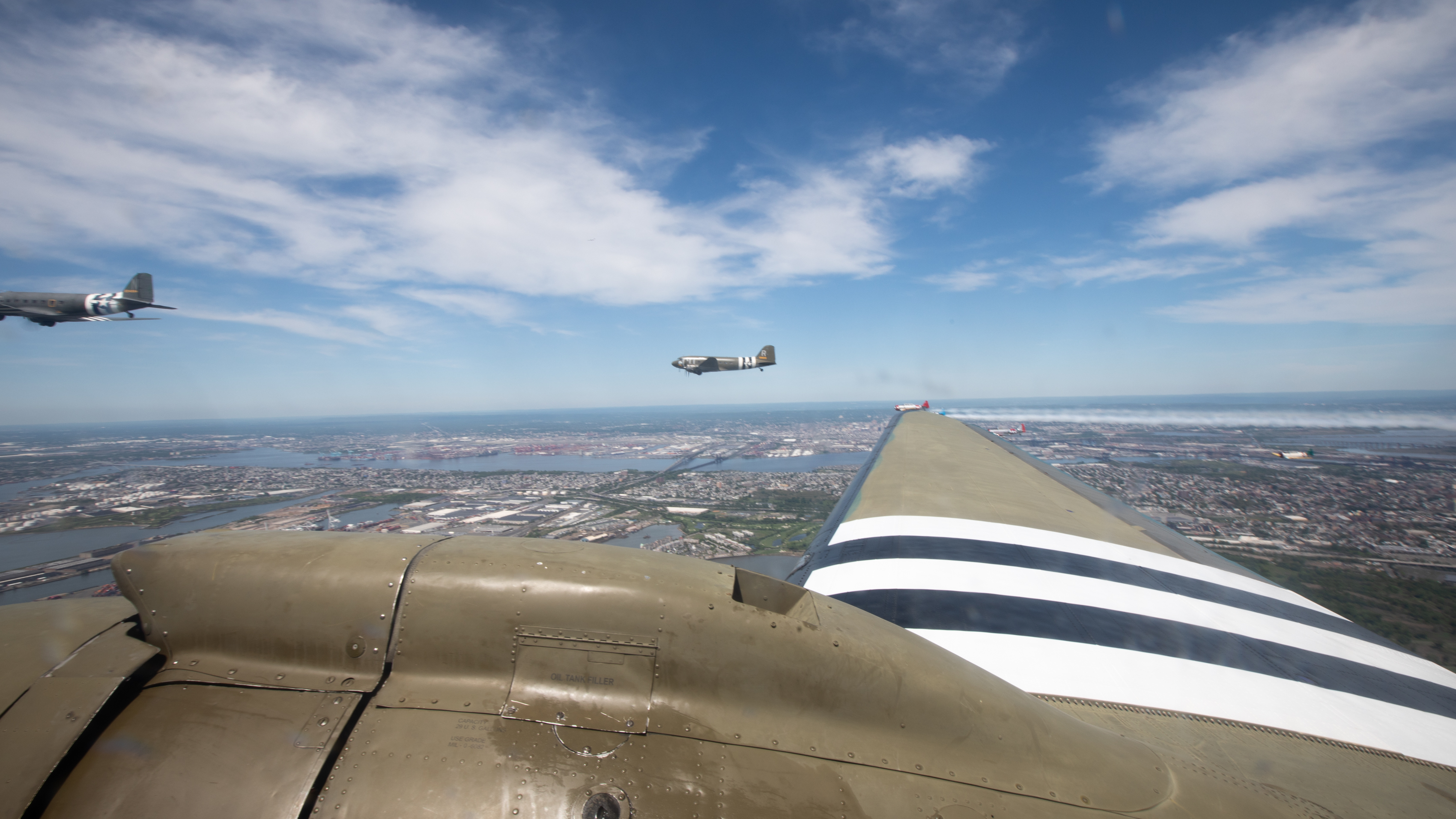 The original DC–3 first flew in December 1935, and required just a few modifications to become the C–47, including installation of a hook to tow gliders, and replacement of the airline seats with metal benches lining each side of the cabin. Flying these aircraft in close formation requires some more anticipation, as the pilots demonstrated on May 18, running down the Hudson River Corridor past the Statue of Liberty, then back north past the Freedom Tower before turning east to Bridgeport, Connecticut, where the F4U Corsair fighter was made, for another overflight.
