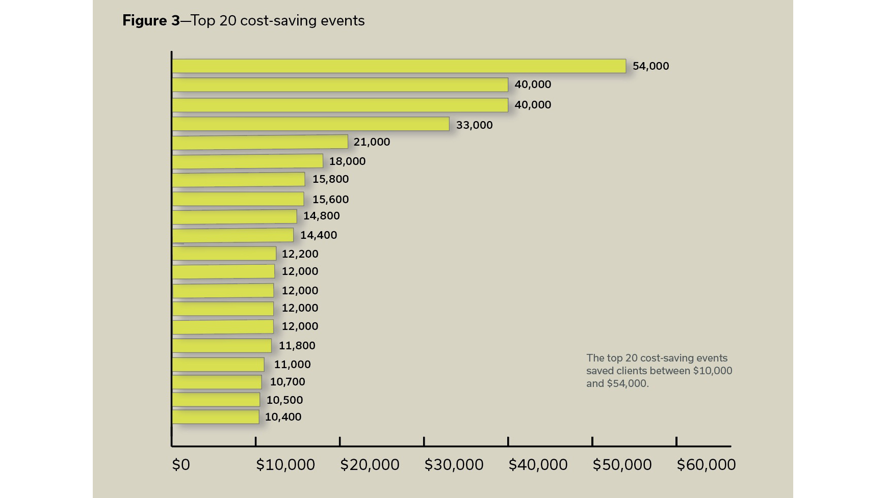 Most of the logged cost-savings events involved savings of less than $10,000, with the most common being in the $2,500 to $5,000 range (see Figure 3). But about 20 percent of the events were home runs that saved the client between $10,000 and more than $50,000. Figure 4 depicts the top 20 such events.