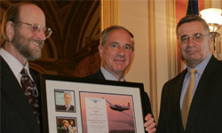 AOPA President Phil Boyer receives the Champion of Public Benefit Flying Award from Rol Murrow, Air Care Alliance (left) and Jonathan Gaffney, National Aeronautic Association (right).