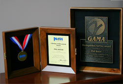 During the 2008 Fall GAMA Board meeting in Phoenix on Nov. 1, GAMA President Pete Bunce and Chairman Alan Klapmeier presented Boyer with its Distinguished Service Award. Boyer was an instrumental force in the coalition that brought about product liability reform, known as the General Aviation Revitalization Act of 1994.