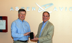 Aspen Avionics President and CEO John Uczekaj gives AOPA President Phil Boyer a certified Aspen Evolution EFD1000 unit.