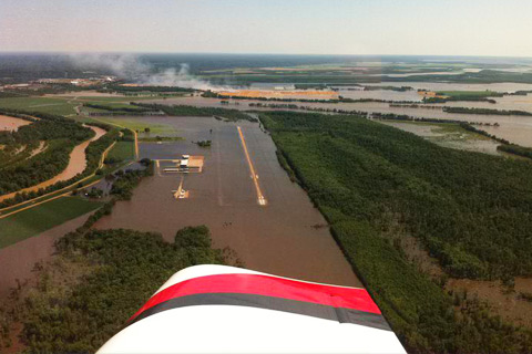 Mississippi River flooding completely covers Yazoo County Airport in Yazoo, Miss.—one of the hard hit airports along the river.