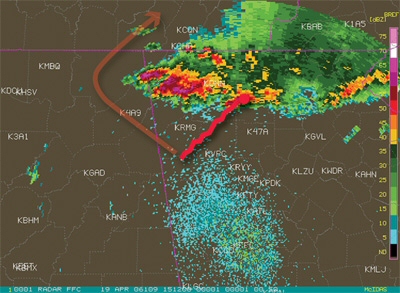 The accident occurred in an area of severe thunderstorms identified as a mesoscale convective system with intense to extreme intensities. The area forecast predicted instrument to marginal VFR conditions during the morning hours, with isolated severe thunderstorms and moderate rain expected after 10 a.m. with cloud tops reaching 43,000 feet. Crossfield obtained five Direct User Access Terminal (DUAT) weather briefings on April 18 and 19. The last briefing was recorded on the morning of the accident at about 6:56 a.m., which included warnings of convective weather later in the day. At 8:56 a.m., the National Weather Service (NWS) warned of a cluster of severe thunderstorms moving into northern Georgia. The area was expected to further destabilize by midday because of surface heating, enhancing the threat of organized severe thunderstorms. Hail, damaging winds, and tornadoes were all possible. It was not a good place to fly.
