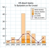 Both total and fatal accident counts increased slightly during 1998 as compared to 1997, but the increase in the estimated number of hours flown was about twice as large. At the same time, the number of deaths decreased by over seven percent. However, trends in the causes of accidents showed little change from previous years. Seventy percent of all accidents are "fender benders" and result in little or no injury. As the graph shows, this trend remains level from year to year. The majority of accidents � 73.4 percent of all accidents and 72.4 percent of fatal accidents � were pilot-related. This number typically increases slightly when all final reports are tallied.