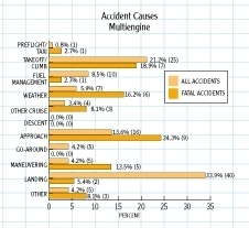 Takeoffs and landings account for huge numbers of mishaps. About 60 percent of all airplanes are damaged or destroyed in these phases of flight. They are seldom fatal because of relatively slow speeds and are nearly always skill-related. Crosswinds and inadequate eye-to-hand coordination are the factors here. Practicing on a regular basis � particularly when the wind is blowing across the runway � will help reduce this type of mishap.