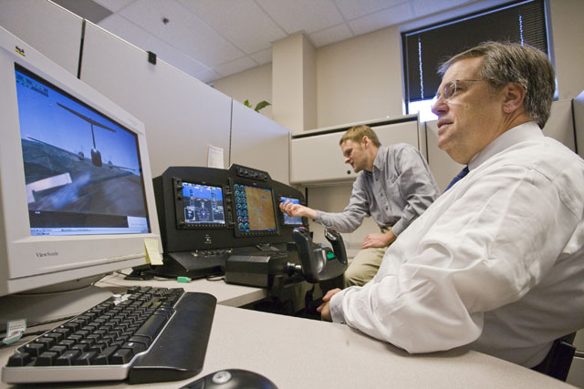 At Garmin’s flight test center, located at nearby New Century Airport, Fuller flew a development simulator showing Garmin’s cutting-edge synthetic vision technology. The software ties the flight computer to a terrain and obstacle database to provide the pilot incredibly good situational awareness. When flying a defined path, the system portrays a series of boxes on the primary flight display for the pilot to fly through. Stay inside the boxes and you always arrive safely at the runway end. Terrain and obstacles show up in real-time as the aircraft passes by. The SVT system has been incorporated into the Cirrus Perspective panel and also been adapted by Diamond and other aircraft manufacturers into their G1000 cockpits. Fuller wraps up his Midwest tour Jan. 30 in Duluth, Minn., visiting Cirrus and will see the technology in the Perspective cockpit.