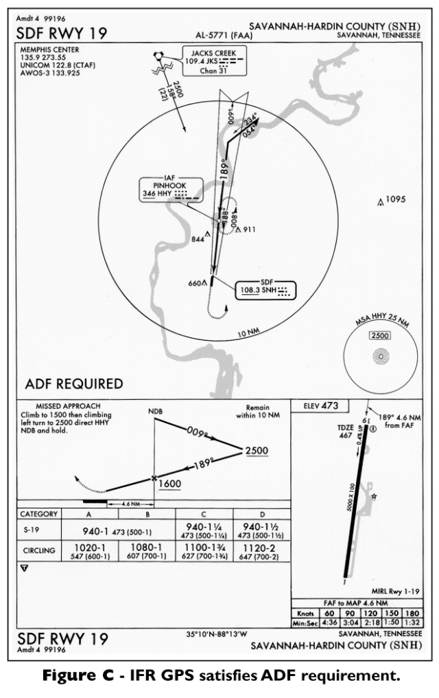 - All LOMs and NDBs with three-letter identifiers should be available from the GPS database. Again, an NDB approach without a GPS overlay cannot be flown using GPS. It must be flown using an ADF (see Figure C).