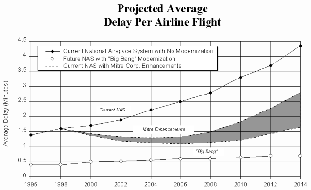 As you may recall, the NCARC report includes a graph that demonstrates that, given no changes to the air traffic control system, a rapid increase in airline delays will occur (see Figure 1). The trend is startling when displayed alone, and it is the Commission’s principal reason for recommending radical, expensive changes.