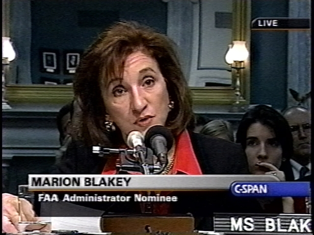 Members of the Senate aviation subcommittee yesterday sang the praises of Marion C. Blakey, President Bush's nominee to head the FAA. But AOPA Legislative Affairs staff attending the hearing report that a final vote on her confirmation is in an indefinite holding pattern because of dispute over an FAA union contract.