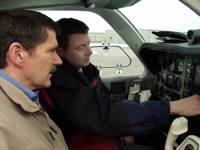![]() AOPA Director of Advanced Technology Randy Kenagy (right) briefs Rep. Denny Rehberg (R-Mont.) on the Capstone advanced avionics suite during a visit to AOPA headquarters today. |