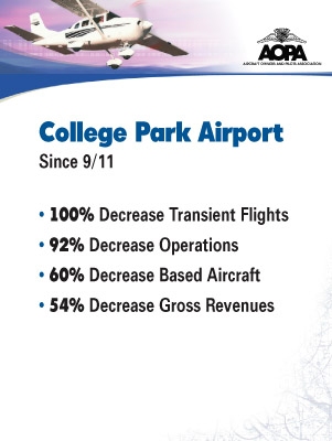 "College Park has seen a 92-percent decrease in operations," said Boyer. "Two airport businesses have closed. A multi-decade flying club based on the airport has ceased operations. Gross revenue for the current year is down 54 percent from 2000. At Hyde Field, only 35 percent of the aircraft remain from pre-9/11 days. Potomac Airfield is down to 80 based aircraft, with job losses experienced by nearly every tenant at the airfield."