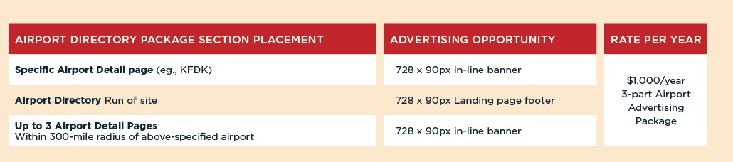Connect with pilots before they take off. The AOPA Airport Directory is part of a suite of flight planning tools in the Destinations portal of AOPA.org, used by more than 51,000 active users each month and generating 153,000 page views. Our Airport Advertising Package offers a simple, cost-effective way to reach pilots as they plan trips to specific airports and surrounding communities.