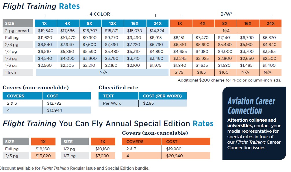 Flight Training is available in both print and digital formats and meets the growing demand for trusted instructional, career, and aspirational content. It reaches more students, new pilots, flight instructors, and aviation schools than any other publication. As the only publication dedicated exclusively to flight training, it features the quarterly Aviation Career Connection section, providing unparalleled access to the learn-to-fly community.