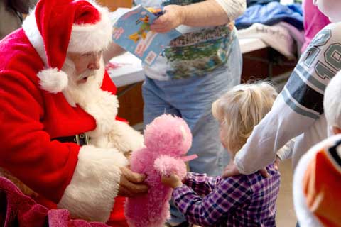 Santa Claus presents a stuffed toy to a young girl on Tangier Island during the Holly Run, a local GA tradition that stretches back more than 40 years.
