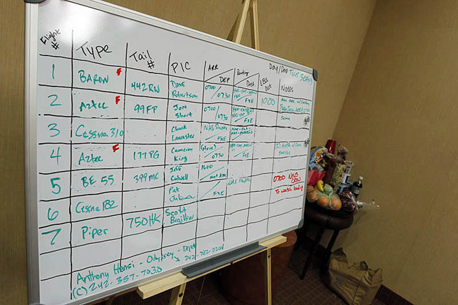 What is usually the Banyan Air Service Coconut Palm Conference Room is now the nerve center for all of the Bahamas Habitat relief operations where they’ve coordinated more than 50 volunteers. The room, with its bare walls, a table and chairs, is transformed into a place where pilots, dispatchers, ground support crew, and shoppers converge. Envelopes taped to the wall indicate where to get petty cash and where to put receipts. Whiteboards contain base notes and flight assignments, and snacks are available for volunteers who can’t step away for lunch. Laptops are tapped into Banyan’s free guest wireless service to track flights and send updates to volunteers on the Bahamas Habitat distribution list.