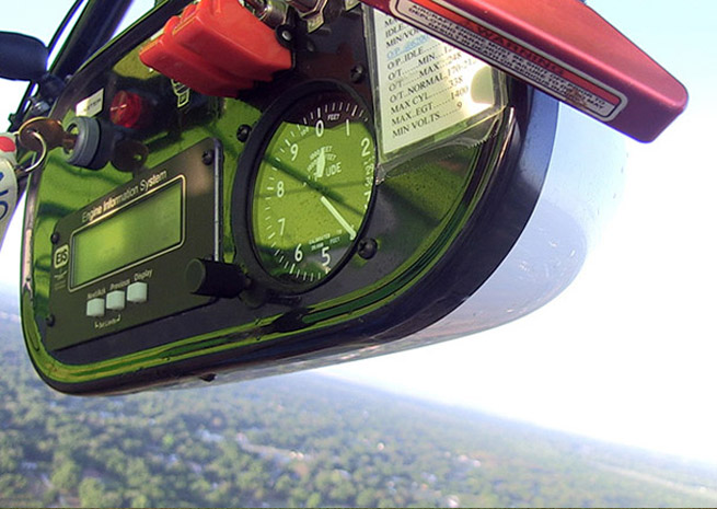 A Hall wind gauge—a plastic graduated cylinder with a small opening at the bottom and a red disk inside that reluctantly lifts alive, edging past 20 and 30 mph as Eugene “Bever” Borne II rotates the nose. (Borne pronounces that nickname like the animal, with a Cajun bayou drawl, but spells it without the “a.”) The mains clear the turf for a smooth liftoff, the craft’s fabric wings taking on the weight of two men, an engine, and little else.