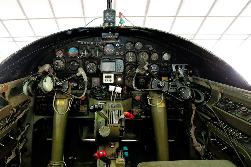 After watching Horner fly, it’s finally my turn. I climb up the ladder in the forward belly hatch and maneuver my way through the “student compartment,” past the jump seat and into the left seat. The cockpit is roomy and the panel surprisingly well laid out, but festooned with buttons and knobs for controlling all sorts of systems—including the four .50-caliber machine guns, two on each side—at the command of the pilot. And, of course, the hydraulically operated bomb bay doors. All in all, a B–25 may have as many as 18 .50-caliber Browning M-2 machine guns, including the nose and tail gunners, the turret and waist gunners; Panchito had 13. The bomb bay can carry up to 3,000 pounds of ordinance, or if range is the goal, an extra fuel tank. Above the bomb bay and just aft of the student compartment is a crawl space to the aft compartments for moving around in flight. On the ground, the aft gunners can enter via their own belly hatch.