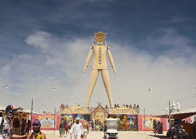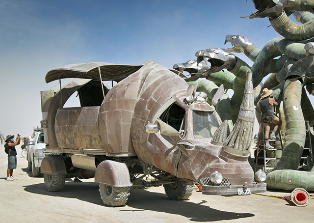 Fancifully decorated "art cars" come by at all hours blaring techno music from massive speakers. Other tunes are blasts from the distant past. Neil Diamond? Donna Summer? Elton John? An art car that serves as a moving pole-dance stage stops a few feet from my tent while performers act out the Divinyls' 1990 standard, I Touch Myself. A tricked out convertible plays the Bob Dylan anthem with the fitting refrain, "Everybody Must Get Stoned" (although, truthfully, the smell of marijuana is less prevalent in Black Rock City than downtown Denver).