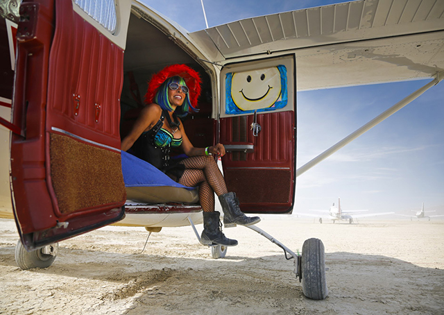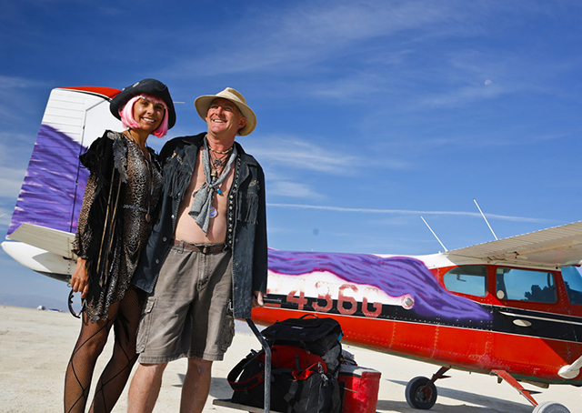Another pilot, Dave “Purple Haze” Barrett, flies passengers all day long in a purple, former Civil Air Patrol Cessna 182 that he keeps especially for Burning Man.