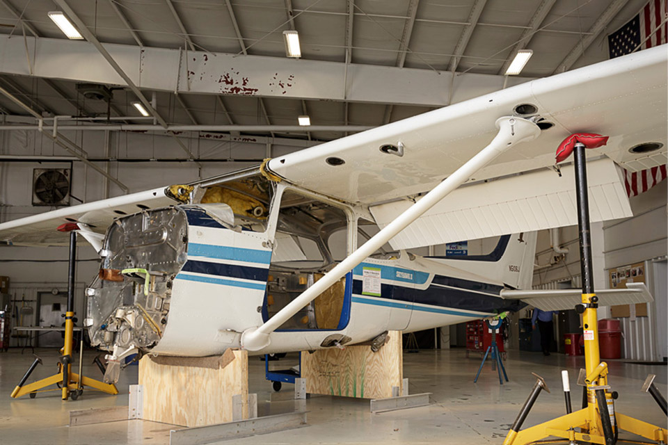 Airplane number 4 is parked in a maintenance hangar at Yingling Aviation in Wichita, Kansas, resembling something a model airplane builder started and then forgot about. Everything from the firewall forward is gone. The fuselage sits on blocks. In the torn-up cabin, a Yingling technician is stripping out avionics from the 1977 Cessna 172N’s panel.