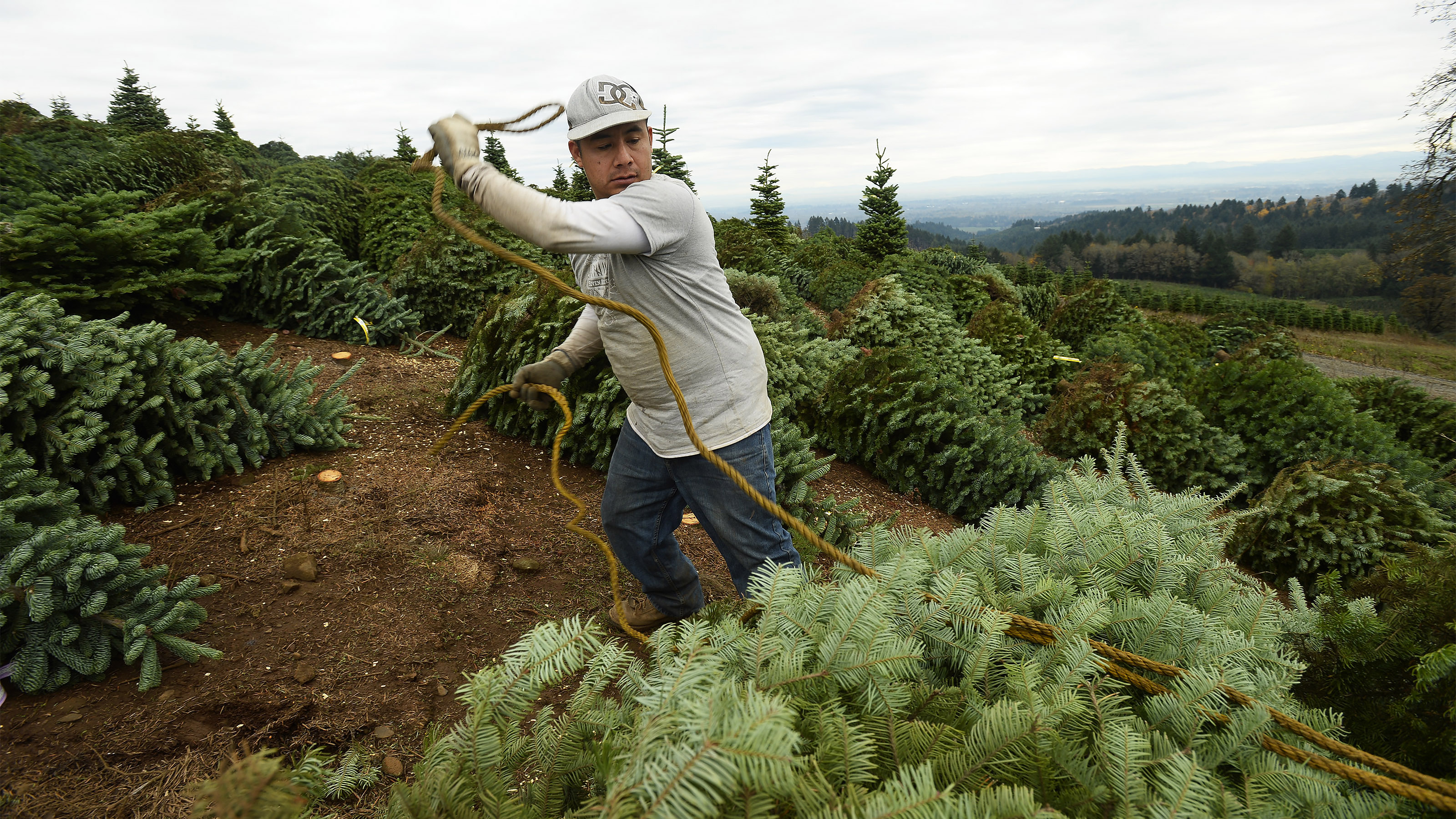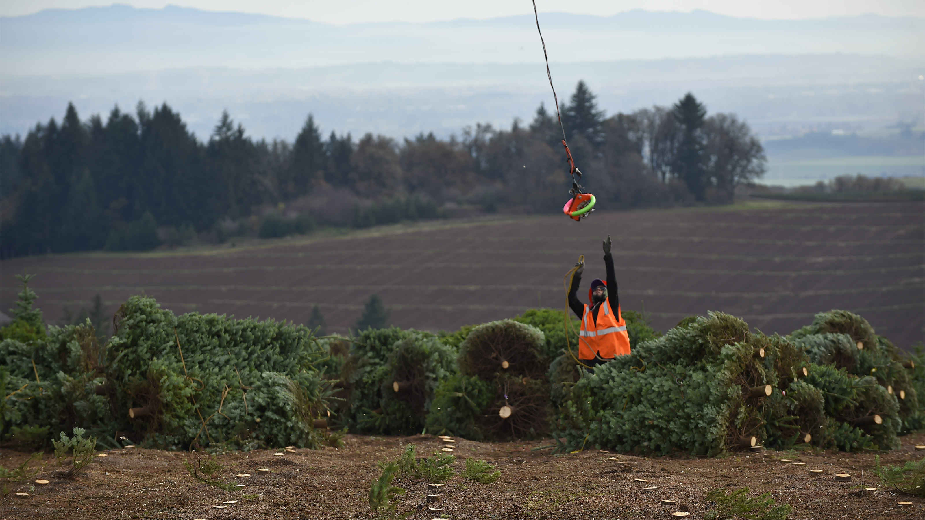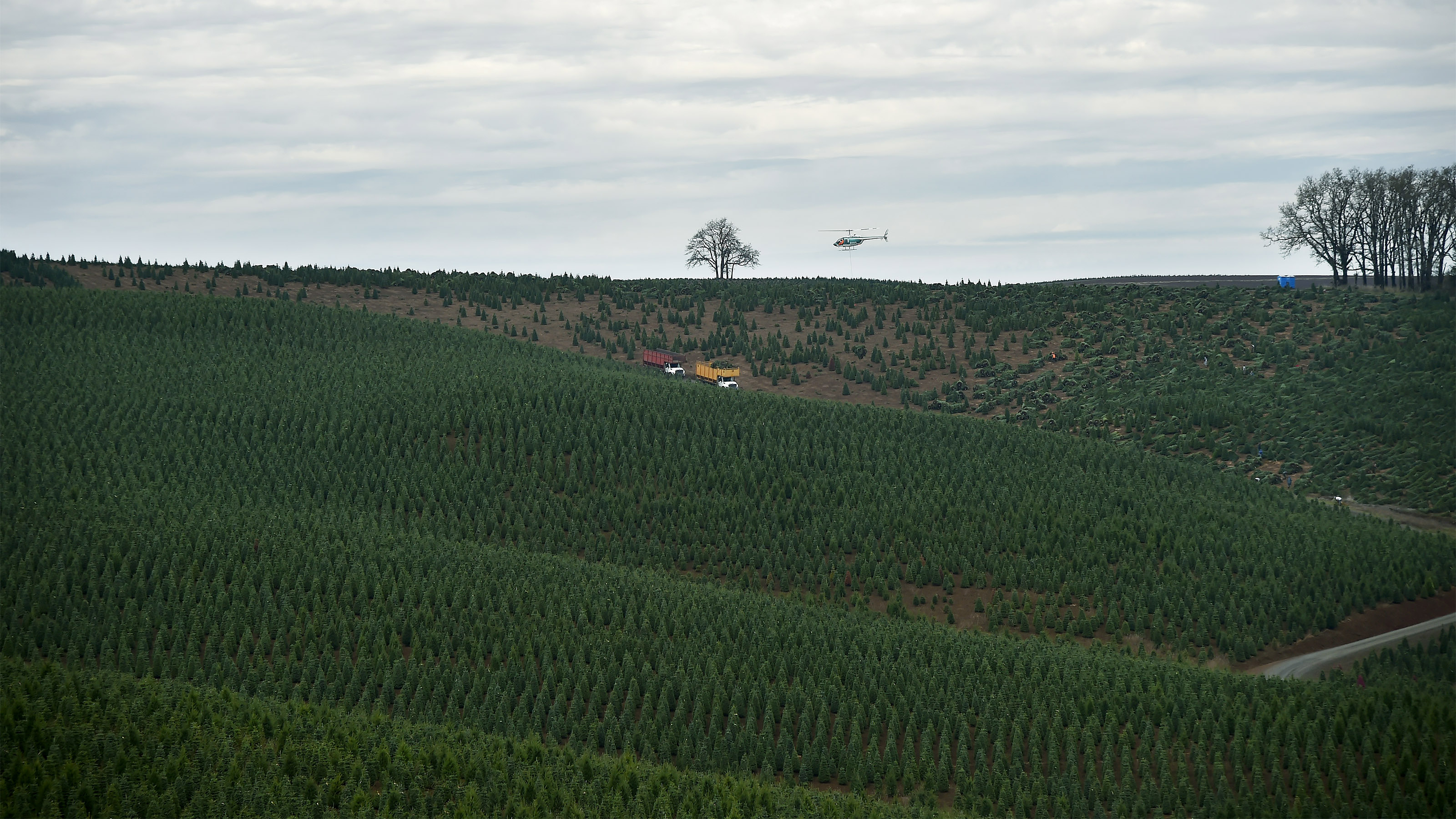 Seven days a week beginning every Nov. 1, helicopter pilots snatch loads of prized Noble firs from the steep hillsides before the trees are slung into the bellies of awaiting trucks and caravanned down jagged Willamette Valley switchbacks to an armada of delivery vehicles, and ultimately into living rooms and dens across the country just in time for the holiday.