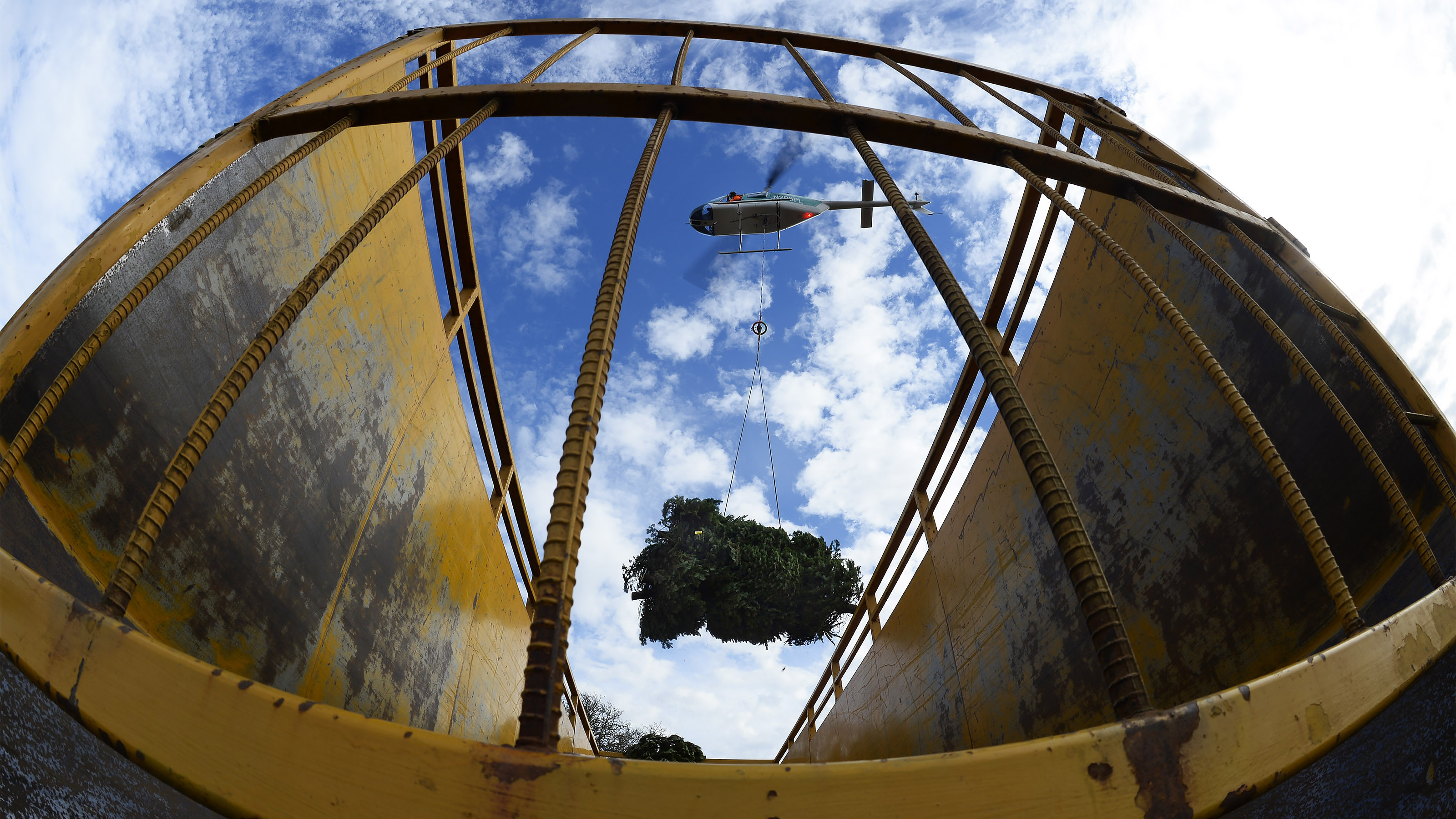Pilots learn to dangle a 25- to 30-foot line to ground crews that have sawed, bundled, and harnessed a dozen or so trees into a rope or “sling” that is caught by a “hooker” on the ground. The sling bundle is then lifted a short distance to waiting trucks called “tubs.” The tow lines are electronically released by pilots hovering over the tubs, and trees slide into the trucks likes pieces of a puzzle.