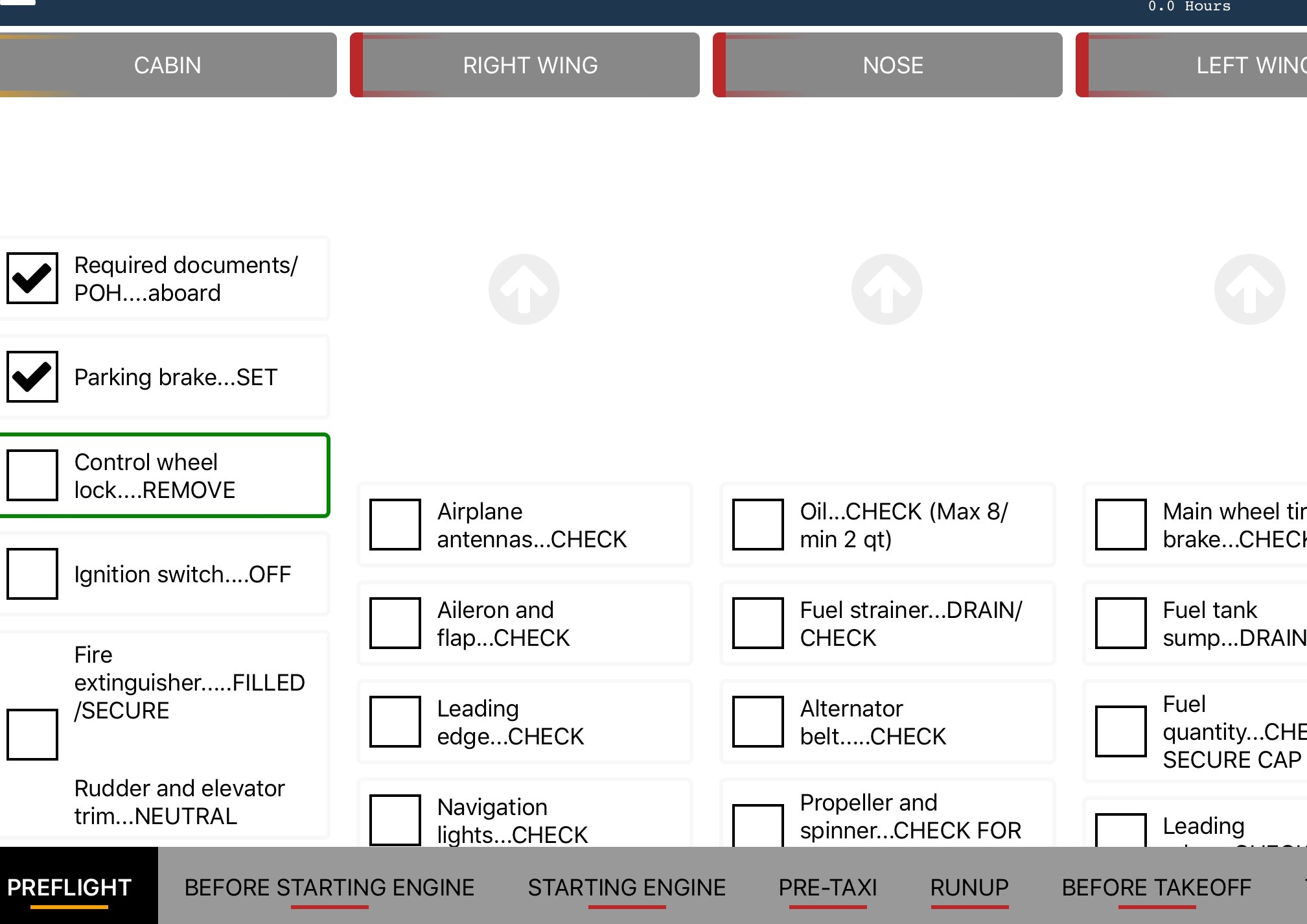 If your device runs on iOS, you can have MiraCheck read off each task to you, just as an actual co-pilot would. The pleasantly modulated computer voice won’t progress until you’ve checked off each item. As you move through tasks, each section’s color-coded progress changes: Red is not begun; yellow is begun but not completed; green is completed.