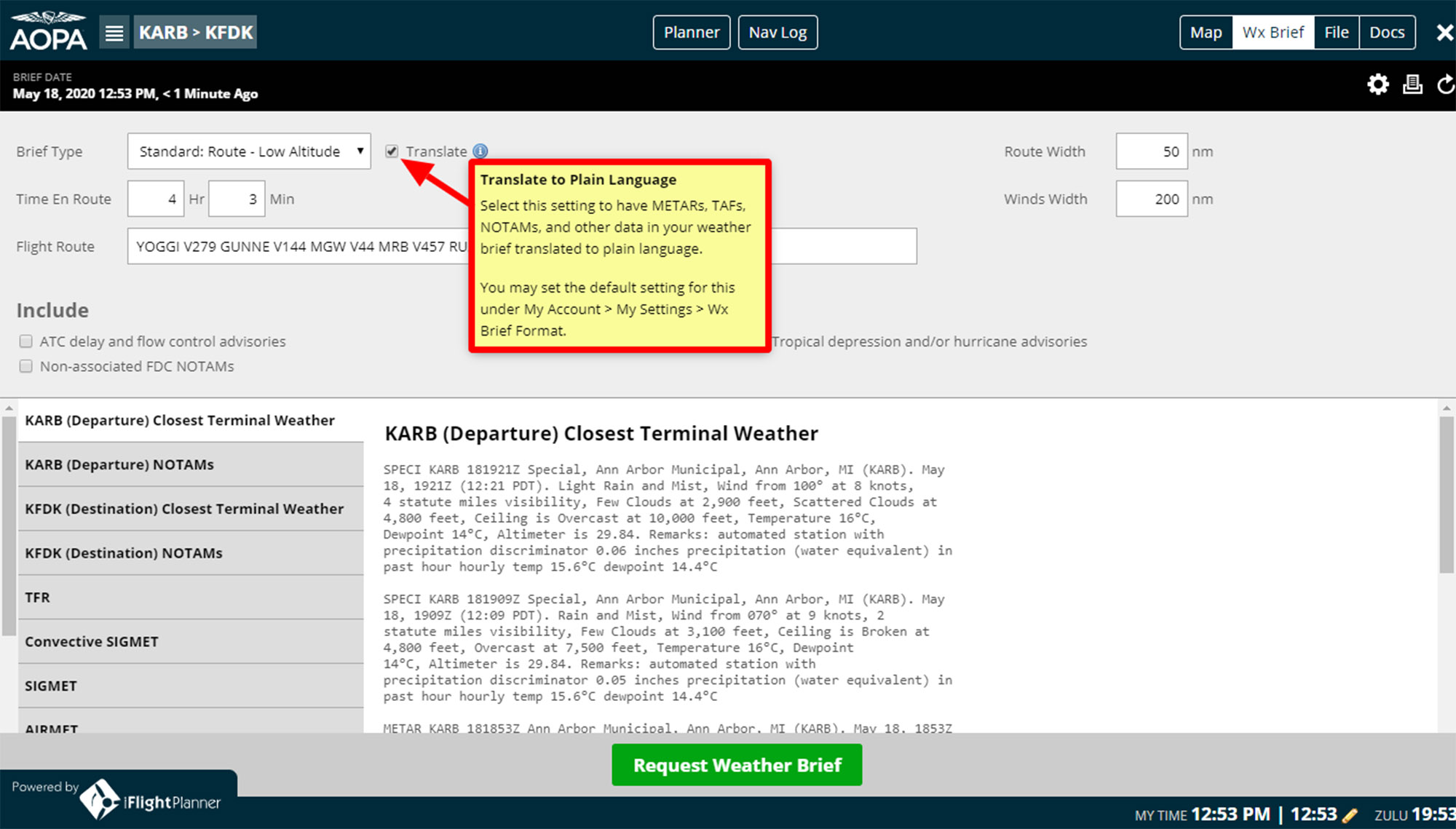 Plain language briefings are now available from the interface with Leidos Flight Service or 800/WX-BRIEF. In addition, flight service recently introduced an update to the flight briefing service that allows users to request an initial briefing from Leidos Flight Service and then—prior to takeoff—receive an updated briefing with the latest flight conditions without duplicating the data you already have. The option is now available, provided you’ve authorized iFlightPlanner to retrieve weather briefs and file flight plans via your Flight Service account.