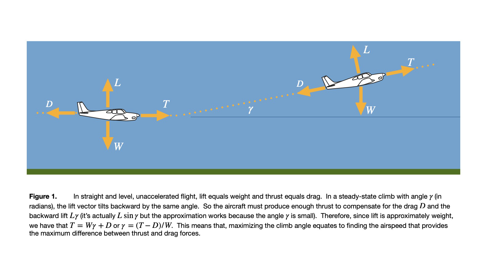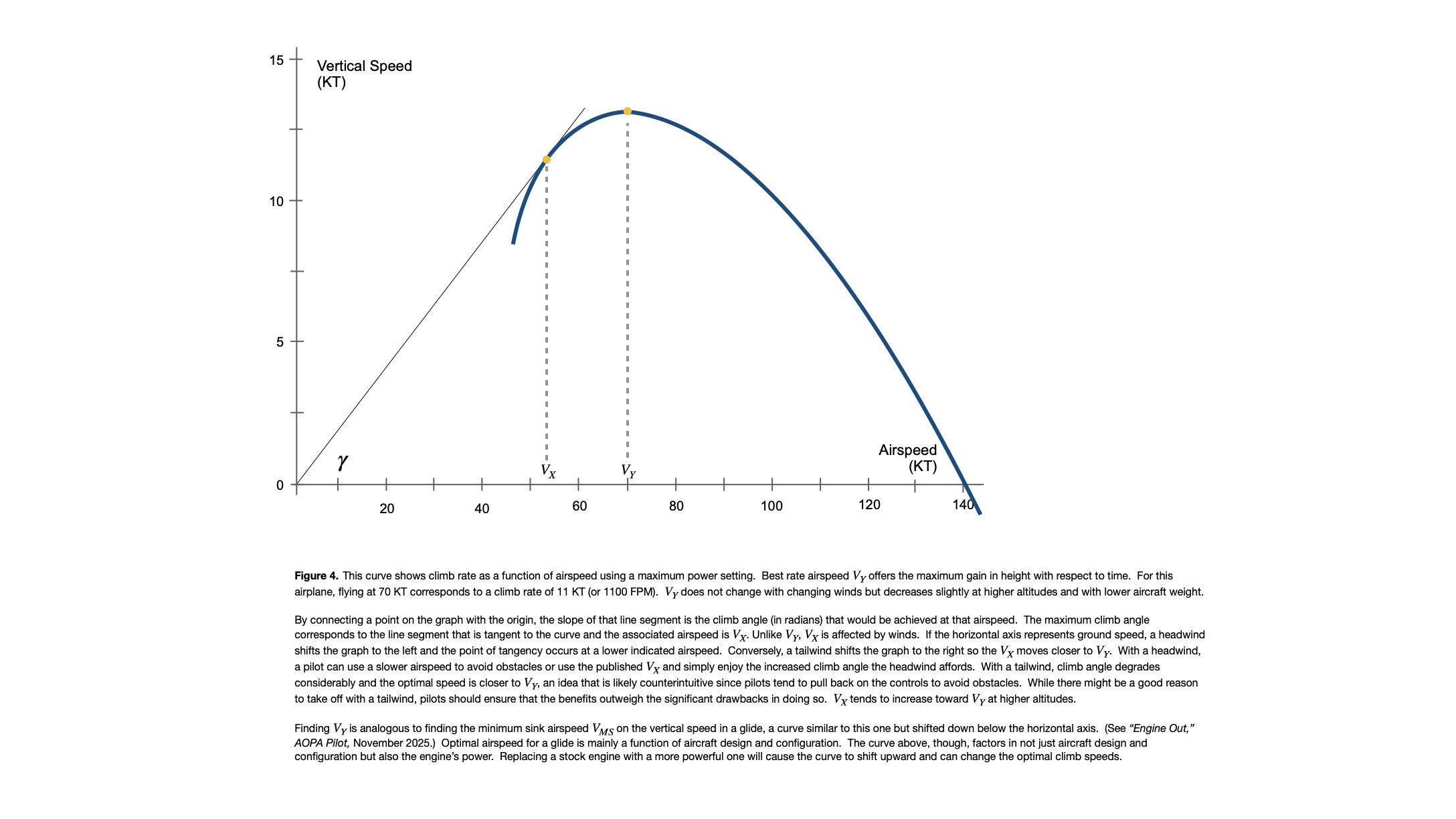 The sidebar figures explain how the best angle of climb airspeed VX and the best rate of climb airspeed VY are defined and determined in flight tests. Best angle of climb VX occurs at the airspeed that maximizes excess thrust. (See Figures 1 and 2, below.) Best rate of climb VY is found at the airspeed that maximizes excess power. (See Figure 3, below.) During certification, test pilots fly the aircraft at maximum power and record the vertical speed across a wide range of airspeeds to produce the curve in Figure 4, from which both VX and VY can be determined.