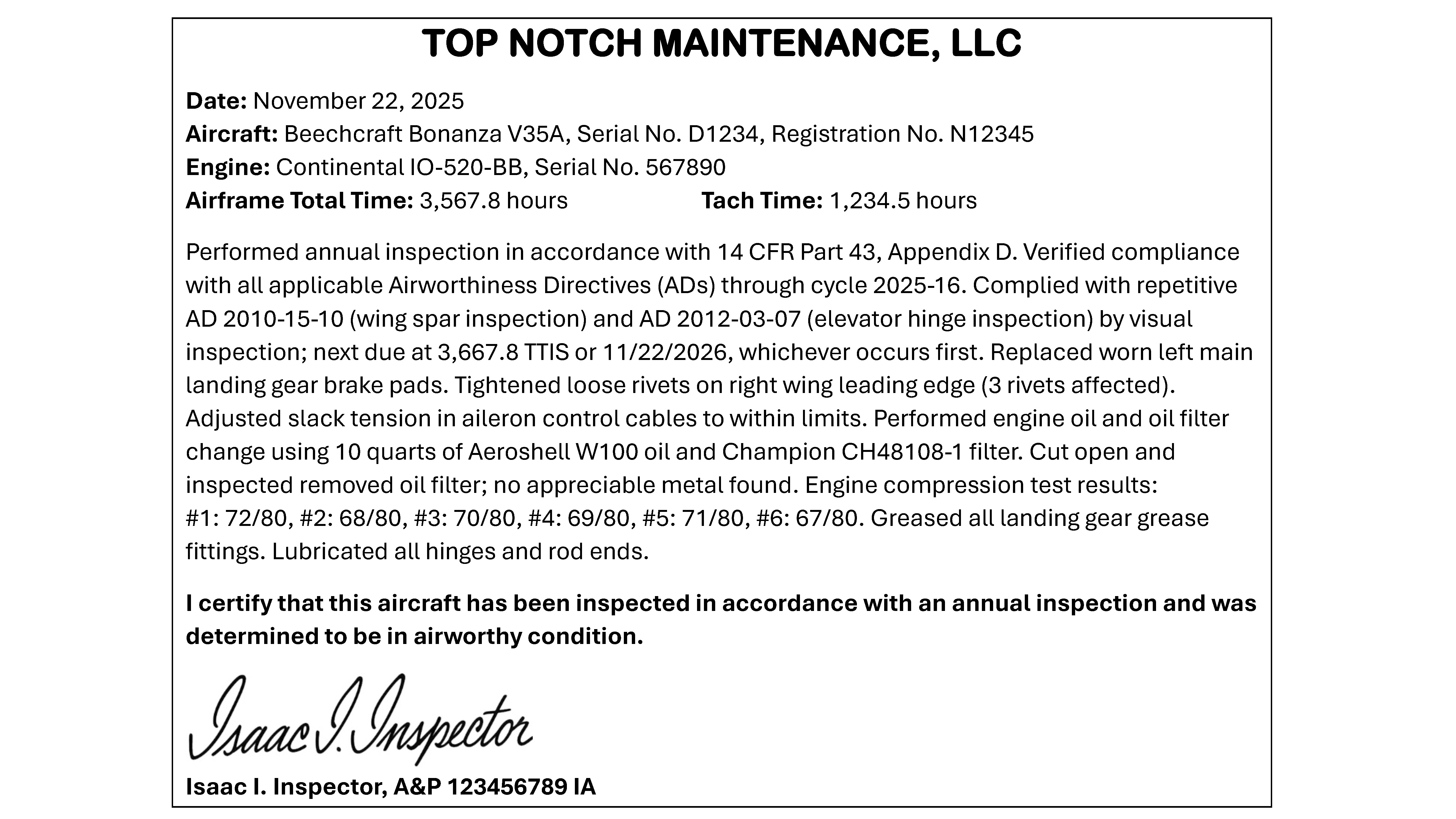 To begin with, Isaac certifies that the aircraft was inspected in accordance with an annual inspection (which is true) and was determined to be in airworthy condition (which is blatantly false). When Isaac inspected Bill’s Bonanza, he actually found that it was unairworthy in several respects—recall the worn brake linings, slack aileron cables, and several AD-mandated actions required.
