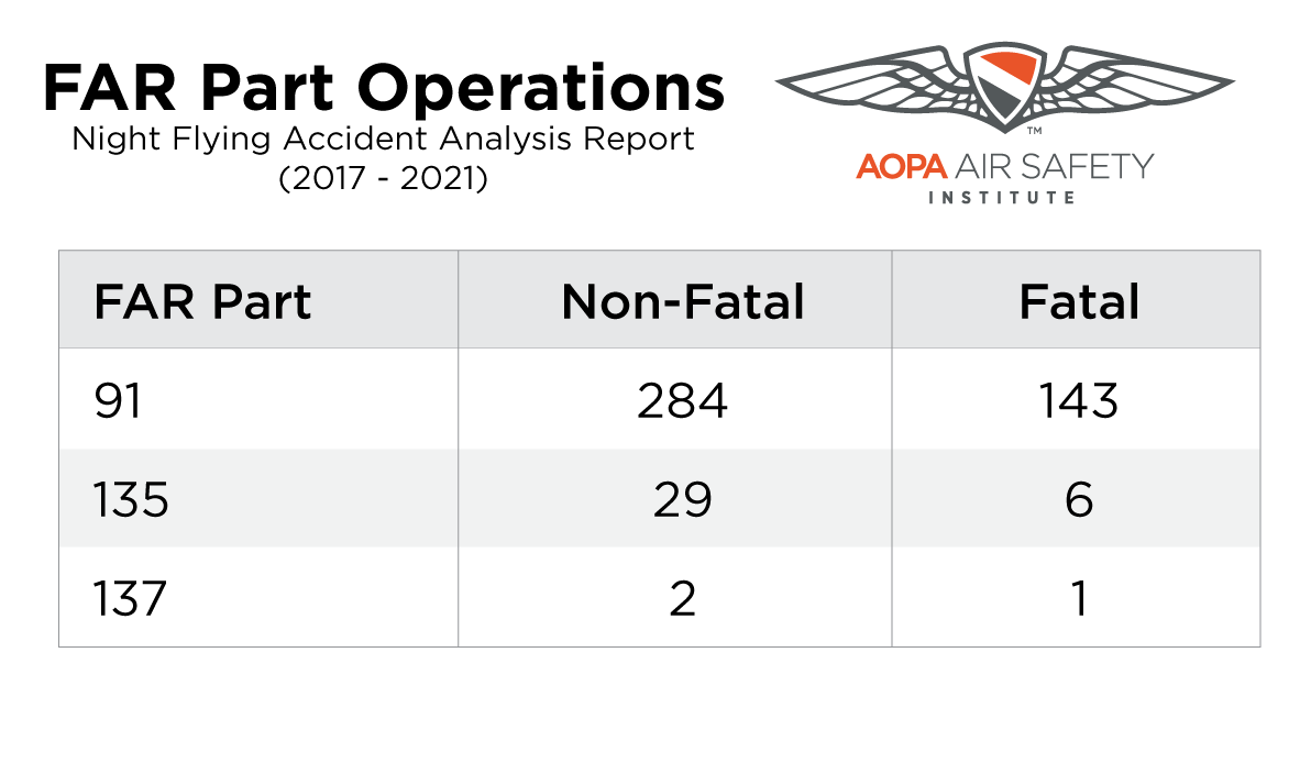 The highest frequency of accidents occurred during Part 91 operations (427). Part 135 is second (35), followed by Part 137 (3). A potential explanation for the small number of night accidents among Part 135 operators is the result of limitations imposed on commercial pilots without instrument ratings. The prohibition of night flights without an instrument rating offers partial protection and supports the validity of such a limitation on a commercial certificate for pilots operating for hire.