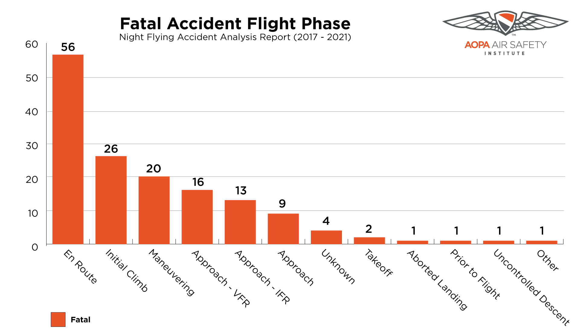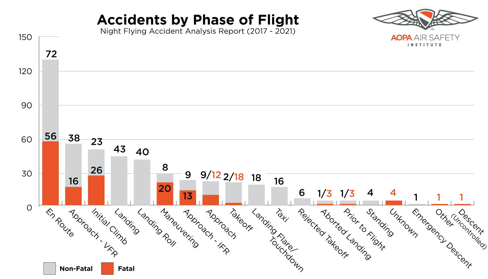 Night accidents occur with the highest frequency during the en route phase of flight (28 percent)—in contrast to overall daytime GA flights when accidents are more common during the landing phase of flight. VFR approach is second (12 percent) followed by initial climb (11 percent). Landing, distinctly absent from the top three compared to daytime accidents, is broken into multiple subparts such as flare and landing roll. All subparts, when combined, only bump landing into second place.