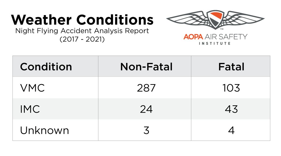 Eighty-four percent of night accidents were in visual meteorological conditions (VMC) and 14 percent in instrument meteorological conditions (IMC). The remainder are unknown. Of the 390 VMC accidents, 103 (26 percent) were fatal. IMC was far more deadly. More than 67 percent of accidents were fatal. Night IMC is highly lethal. Flights occurring during these conditions warrant additional mitigations.