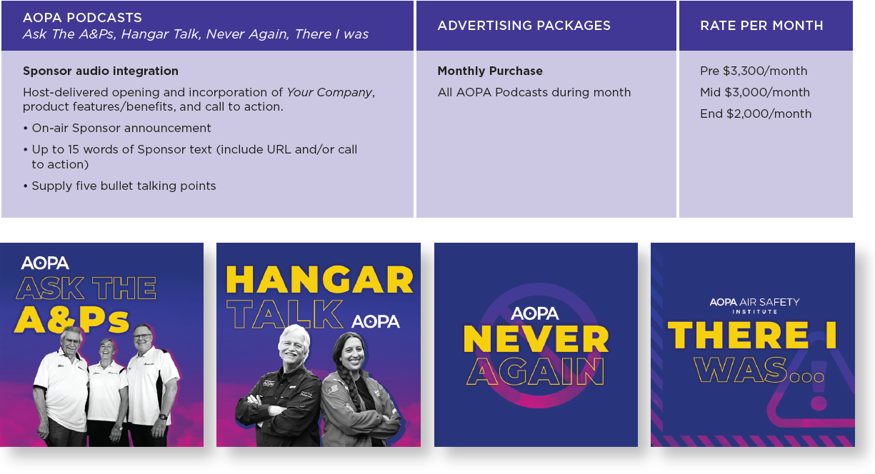 Reach a younger, more diverse pilot audience with AOPA’s top-performing podcasts—Hangar Talk, Never Again, There I Was, and Ask the A&Ps—downloaded over 69,000 times each month. With customized ad packages, your brand can tap into the rapidly growing general aviation content space, delivering a personal touch through hosted audio. Ask your AOPA Media representative to get started today.