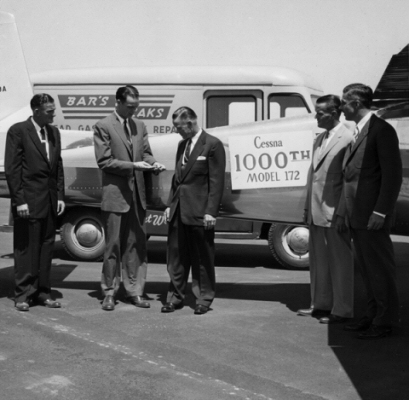 | | In July 1956, Ward and Ralph McDowell from Forth Worth, Texas, took delivery of Cessna's 1,000th Cessna 172, which rolled off Cessna's assembly line. Cessna President Dwane Wallace (second from left), presented the two brothers with a gold key to the airplane. | |