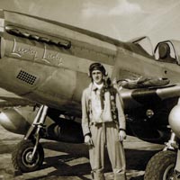 Frederick “Ted” Bullock’s job was to escort bombers to the Ploesti oil fields, where he got three victories in 12 missions. On one of those missions an American pilot accidentally shot 13 bullets into his wing, since the profile of a Mustang was so similar to one of the German fighters. Later on a mission to Russia, with a German Messerschmitt Me 109 in front of him, Bullock accidentally shot at the pilot who had hit him on an earlier mission. He missed. The commander, upon hearing about it, said, “You two can never fly again on the same mission.” In addition to the aircraft he shot down over the Ploesti oil fields, he shot down two Me 109s and an Italian aircraft in German markings that was flown by the Romanian air force. Bullock is a close friend of fellow fighter pilot and test pilot Bob Hoover.