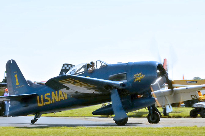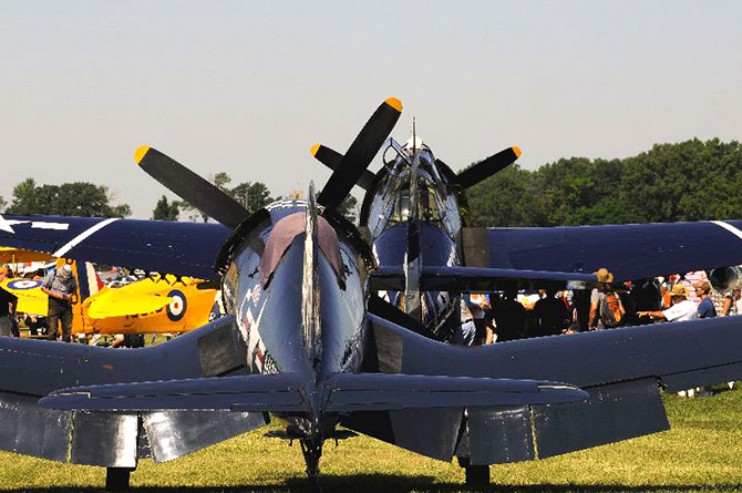 A Grumman Bearcat was among Monday's Oshkosh arrivals.