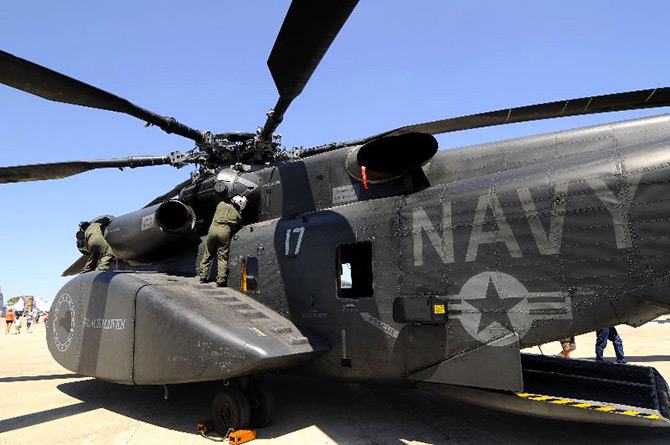 After arriving at Oshkosh the crew of a Navy MH53E secures their aircraft.