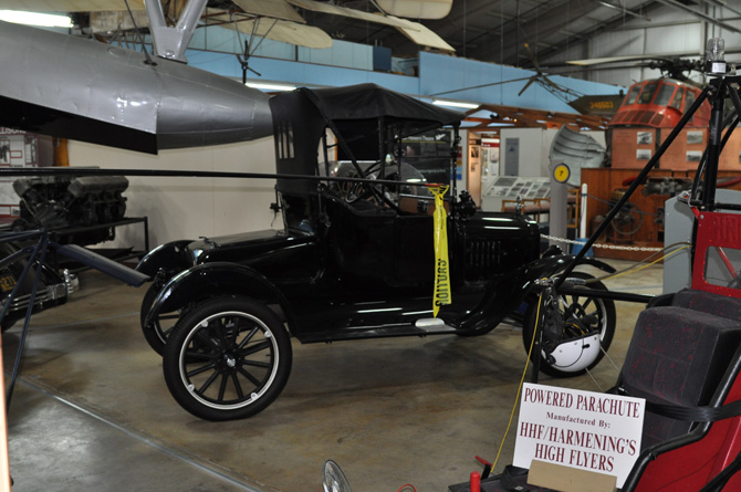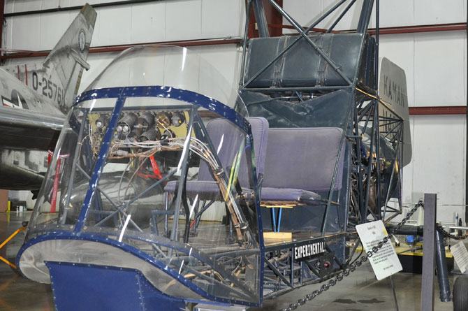 While most major restorations take place behind the scenes in the restoration hangar, a K-class Navy airship has been taking shape amidst the exhibits in the civilian hangar. Volunteer Russ Magnuson, standing by a sign that read “No Parking / Blimp Parking Only / All others will be towed,” said that nothing was inside the airship when it arrived at the museum; the interior had to be re-engineered from photographs. This type of blimp was used for spotting enemy U-Boats during World War II, and as another sign proclaimed, “No vessel escorted by a blimp during World War II was ever sunk by an enemy submarine.”