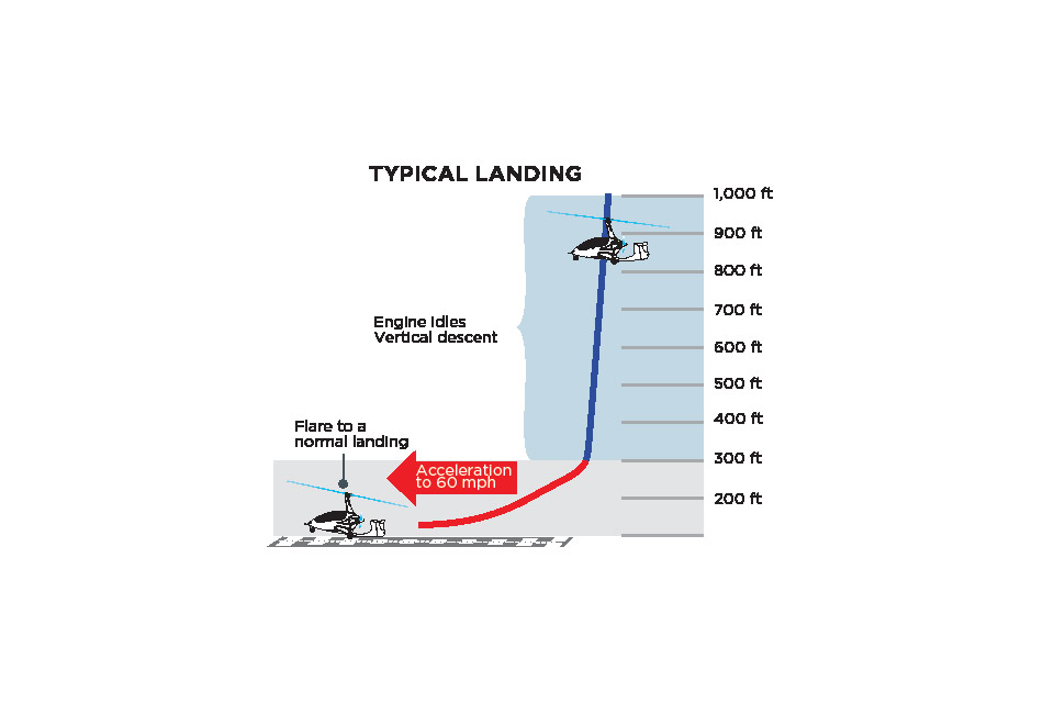 All gyrocopter landings are autorotation landings. This is not the high-skill emergency maneuver that it is in helicopters. During an emergency engine-out, no split-second action is required to lower the collective. Maneuver to arrive at the flare point at 60 mph and perform a normal landing.