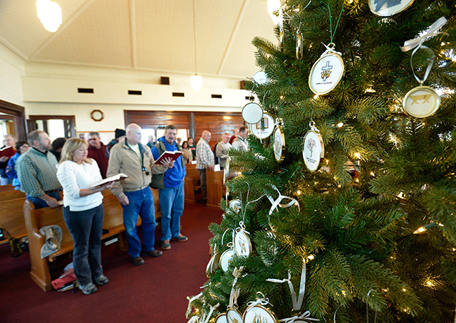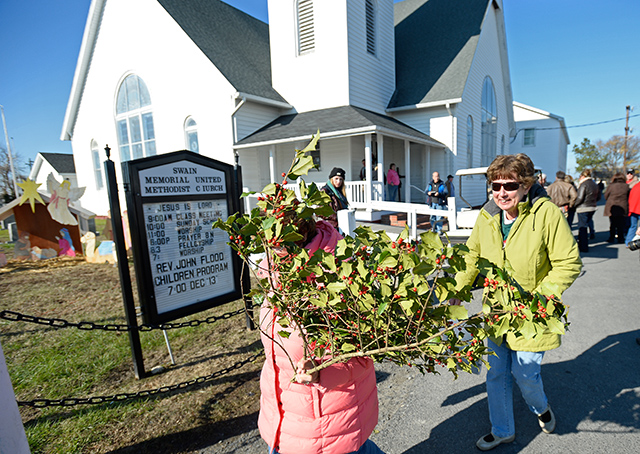 After landing, about 100 participants walked down a narrow road and across a wooden bridge to the packed Swain Memorial United Methodist Church for an early Christmas service, where Hoover joined them after his special house call to Lilly.