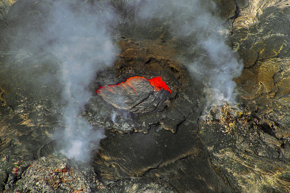 Pu’u o’o crater, Kilauea volcano, Hawaii. “Volcanos create their own smog—we call it vog—and it can be very disorienting. It’s like suddenly being in the Los Angeles Basin during a Stage-4 smog alert. I’ve had vertigo while flying in circles in the vog. It was like being in a cloud with no horizon, only a white haze.”