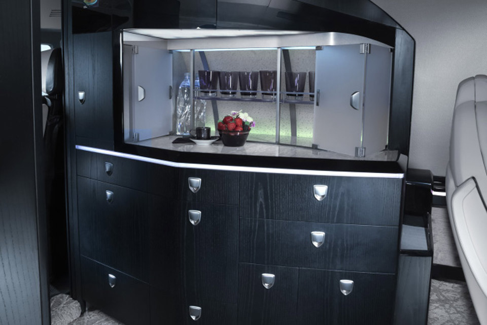 In addition to the standard configuration, operators have the option to order a few different configurations in the main cabin—a larger refreshment center that covers the first cabin window, offering more storage; a smaller refreshment center on the right side, with a single additional side-facing seat; a forward jump seat that slides out of the closet and faces forward into the cockpit; and in the aft club section, a three-place divan can be installed on the left side.