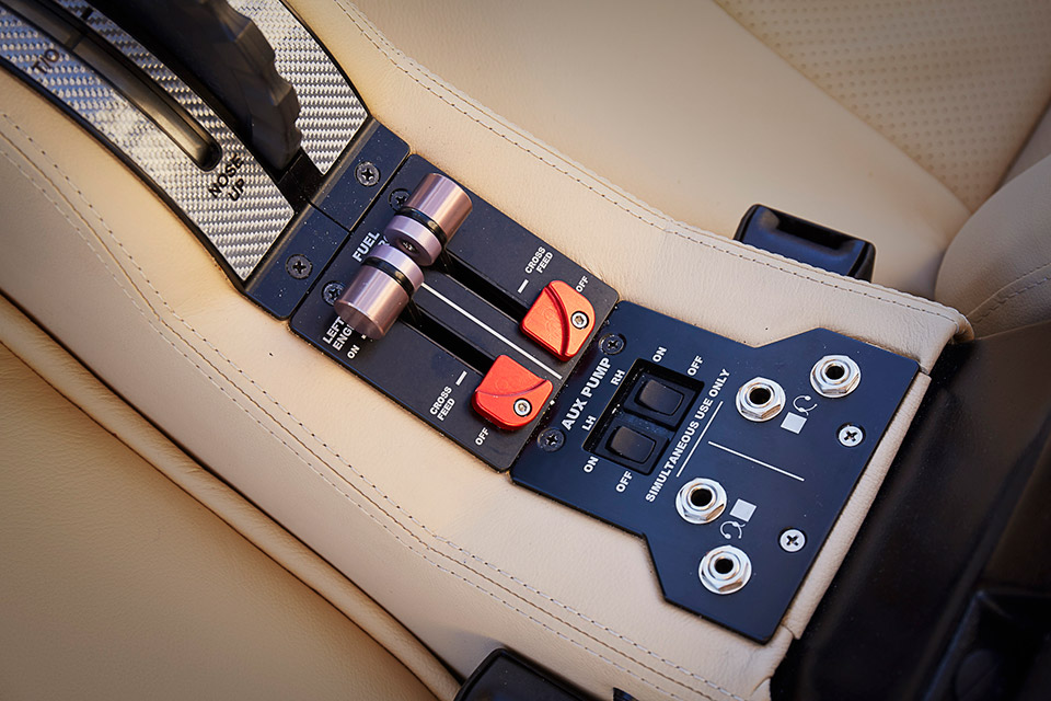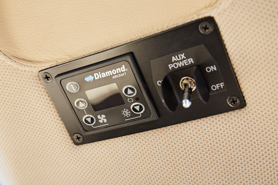 The thigh-support portion of the DA62’s pilot seats folds down for easy boarding, meaning that you no longer have to step on the seat to get in. The seat-back position is adjustable, and the seats have inflatable lumbar support. And what’s this? Cup holders, and even customized fixtures on the forward sidewalls that are designed to hold water bottles. Meanwhile, the airplane’s monocoque cabin structure is designed for optimal crashworthiness.