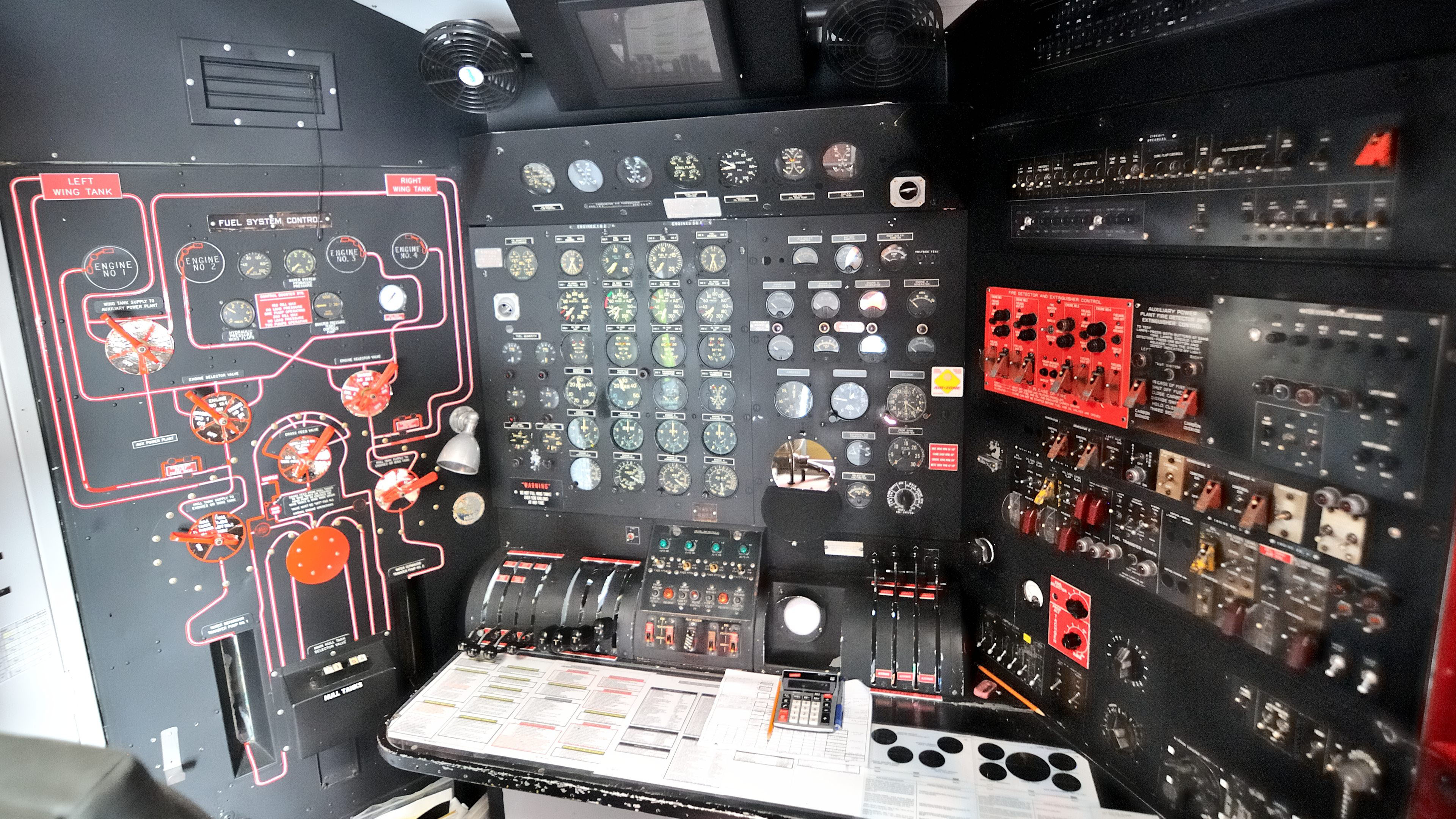 As water bombers—the Mars’ No. 3 and No. 4 fuel tanks were converted to carry water scooped from a lake—they can carry 7,200 gallons of water. It’s scooped at a rate of one ton per second, and the airplane takes 30 seconds to load, explained Charlie Watts, who works for Coulson as a flight engineer on its C-130 tankers. “You can feel it when the probes go down” to scoop water, because the Mars pitches forward, he said. Foam or gel fire suppressants can be injected into the water as it is loaded, depending on what is needed for the fire.