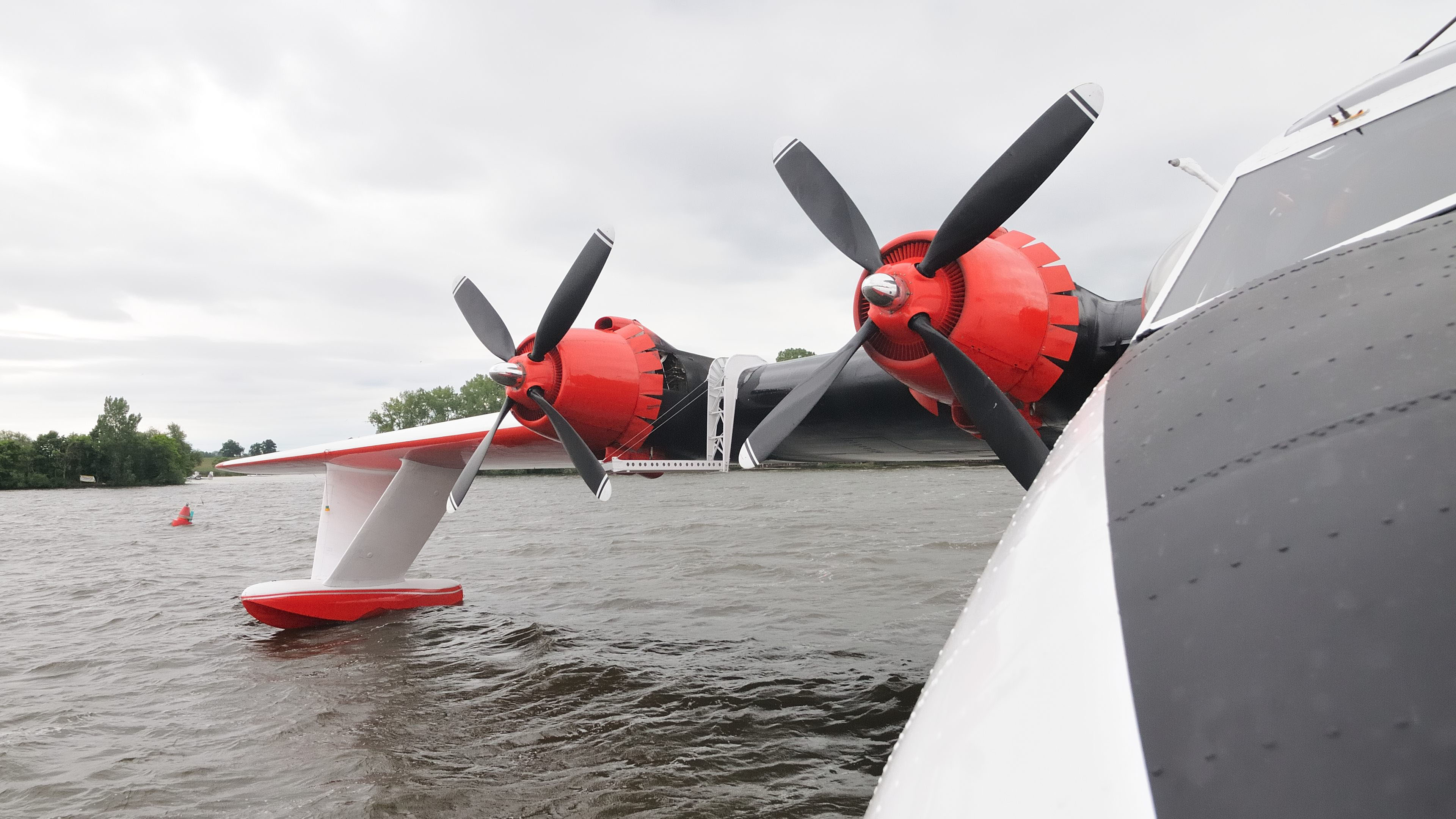 A tour of the aircraft reveals its nautical heritage. To most pilots, the structure resembles a boat more than an airplane. Hatches and their mechanisms are very nautical in appearance, as are the stairways between decks. The rudder and elevator are controlled by massive push rods extending from the cockpit, and those controls are locked using pins from inside the seaplane’s hull. Ingeniously, those pins are used as keys to interlock those control surfaces to the flight controls—preventing takeoff when the controls are locked.