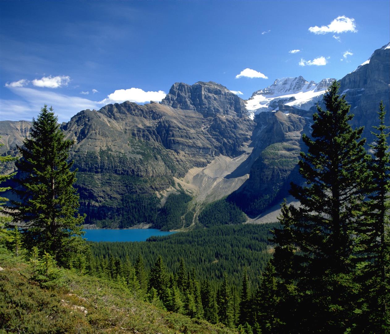 No visit to Lake Louise is complete without the eight-mile drive to Moraine Lake, in the Valley of the Ten Peaks, the second valley south of the mountains that flank the southern shore of Lake Louise. Under a summer sun, Moraine Lake is the color of perfect blue Kingman turquoise. From other angles it looks like Windex! You can canoe on the lake, but the higher you get above the water the bluer it appears, so at least walk up to the viewpoint on the rockpile at the lake’s east end, one of Canada’s most photographed views. Your friends back home will think you Photoshopped your pictures; no lake can be that blue! The classic hike here is to Larch Valley and Sentinel Pass (see photos for details on this hike).