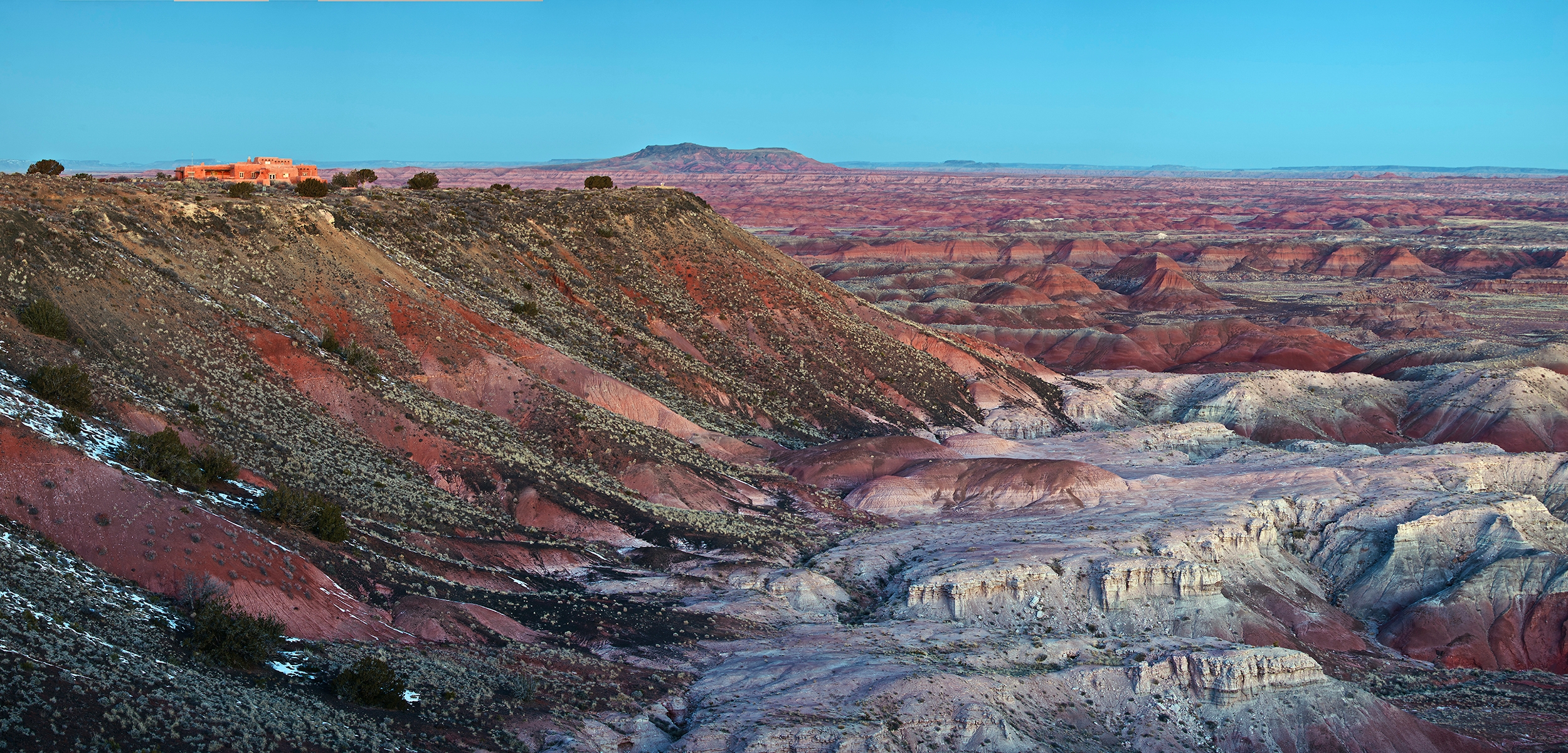 Petrified Forest National Park: Fly to Winslow, as Holbrook lacks rental cars. This park is especially beautiful in winter with a slight dusting of snow and the sun at a low angle. Easy loop drives take you through a number of areas where you can get out and explore, or camp overnight. The park has northern and southern sections, with a narrow corridor in the middle. Food service is available only at the northern entrance, also the park headquarters. There’s no lodging, just backcountry camping, or you can stay at the historic La Posada in Winslow, the last and most elegant of the Fred Harvey hotels built by the Santa Fe Railroad. It was designed by Mary Jane Colter, the great Southwest architect also responsible for the Bright Angel Lodge at the Grand Canyon and La Fonda in Santa Fe.