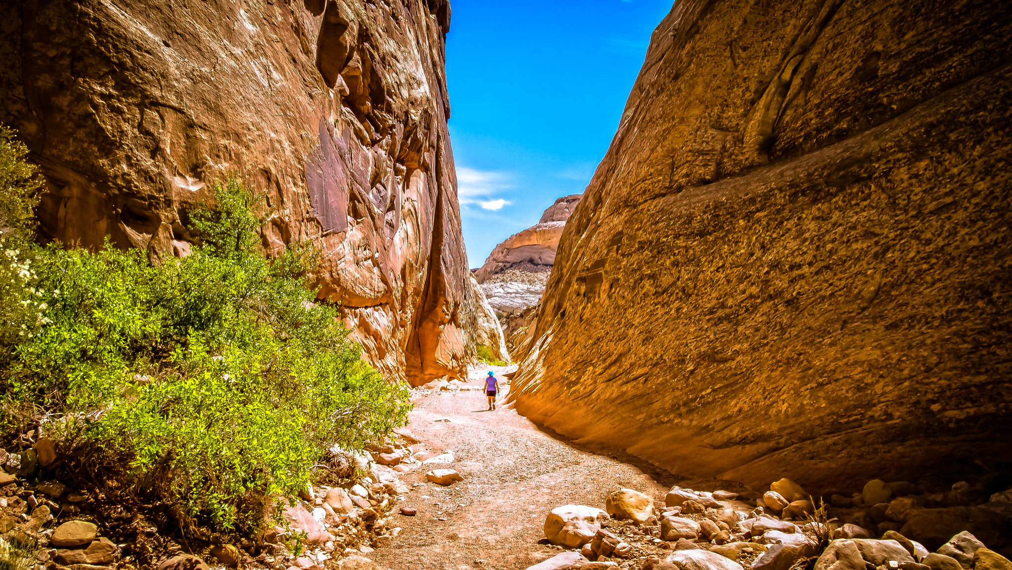 Capitol Reef National Park: If you’ve flown over much of southern Utah, you’ve noticed several long, north-south running monoclines, where the earth has been pushed up, including Comb Ridge near Bluff, the Cockscomb inside Grand Staircase-Escalante National Monument, the Kaiparowits Plateau north of Navajo Mountain and Lake Powell, and the Waterpocket Fold, between the Boulder and Henry mountains. Little-visited Capitol Reef encompasses the Waterpocket Fold and can be accessed from Hanksville. A hiker’s dream, the park is filled with interesting geology and over 2,700 fruit trees planted by Mormon pioneers. Other than the orchards, there’s no dining or lodging in the park besides camping, but exceptional dining can be had west of the park in Torrey. Exceptional accommodations are available in Teasdale, with more in Torrey.