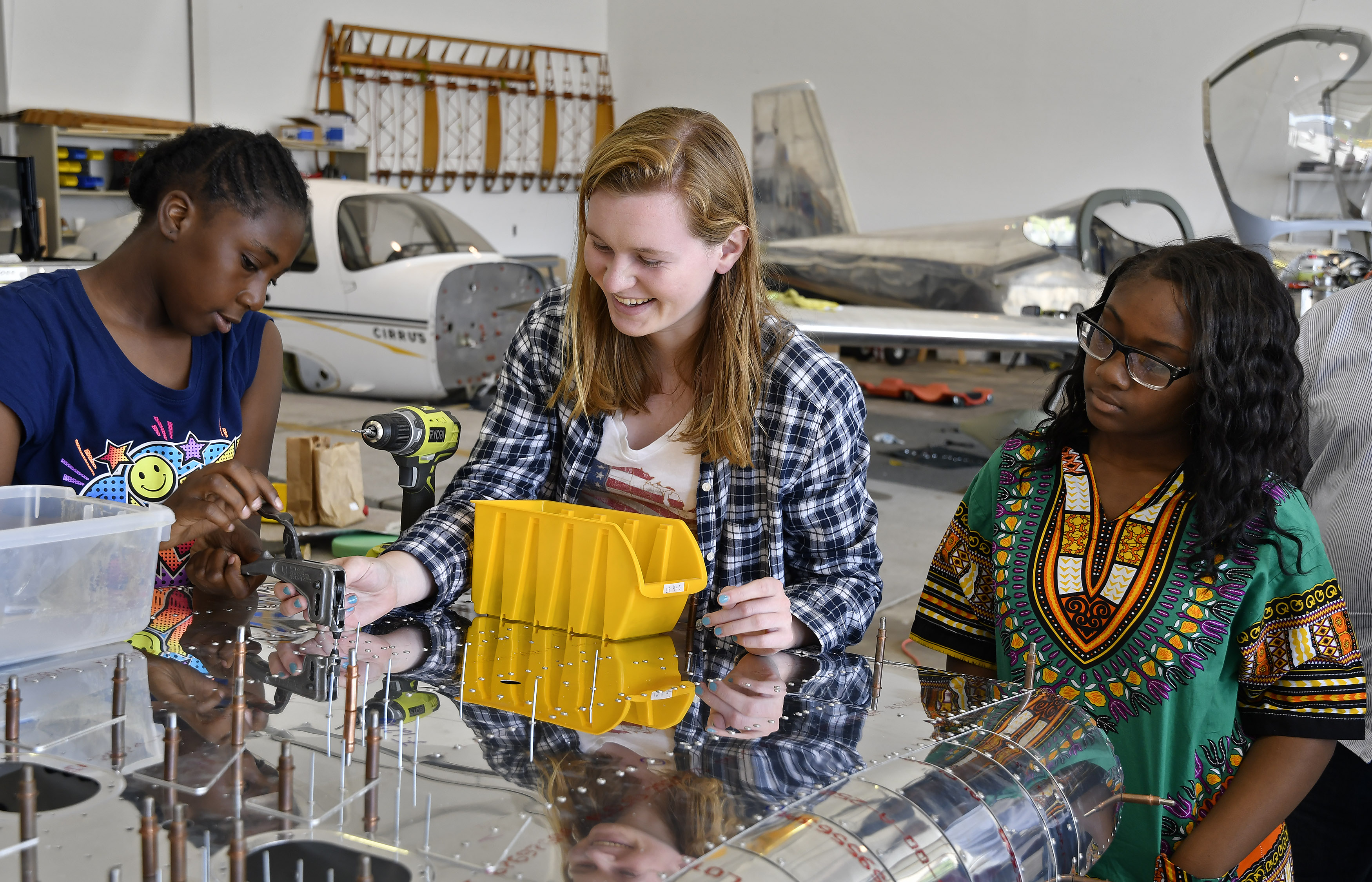Crenny began her affiliation with Stratus as a high school junior and is now a University of Delaware junior studying civil engineering. She credits her mother with discovering the aviation youth program. They “came down one weekend to hear about the program and I thought, ‘OK, why don’t I come back next weekend?’” She has been working on aircraft or mentoring other students ever since. Crenny stopped by the expansive white hangar on her summer break to mentor younger students. She added that she originally “had no experience with aviation, and I’ve helped to build a plane from a kit that is sitting behind me right now. I remember when I didn’t know how to use tools so it was nice to see some new faces today and teach them the basics.”
